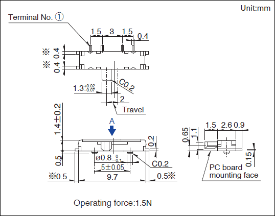 外(wài)形圖![]() 焊接處尺寸圖![]() 自(zì)A方向看(kàn)。 電(diàn)路(lù)圖![]() 包裝規格載帶
