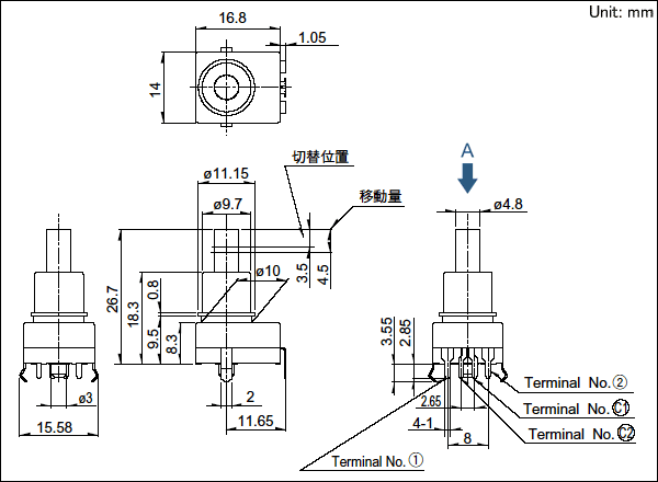 操作(zuò)方向:Vertical ・ 最大(dà)額定值:1A 14.5V DC ・ 行(xíng)程:4.5mm (To↓tal travel) ・ 電(diàn)路(lù)數(shù):1/2-pole |